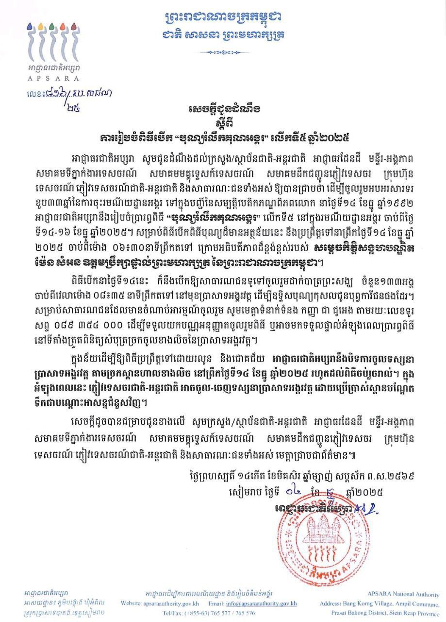 សេចក្តីជូនដំណឹងរបស់អាជ្ញាធរជាតិអប្សរា ស្តីពីការរៀបចំពិធីបើក បុណ្យរំលឹកគុណអង្គរ លើកទី៥ឆ្នាំ២០២៥.. សូមអានលិខិតជូនដំណឹងទាំងស្រុង..