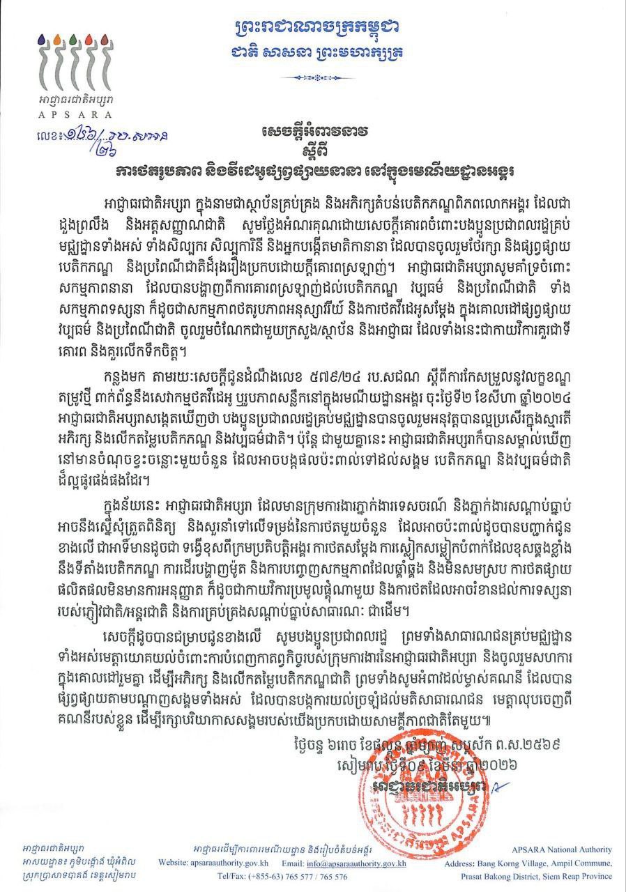 អាជ្ញាធរជាតិអប្សរា ចេញសេចក្តីអំពាវនាវ ស្ដីពីការថតរូបភាព និងវីដេអូផ្សព្វផ្សាយនានា នៅក្នុងរមណីយដ្ឋានអង្គរ សូមអានលិខិតអំពាវនាវទាំងស្រុង..