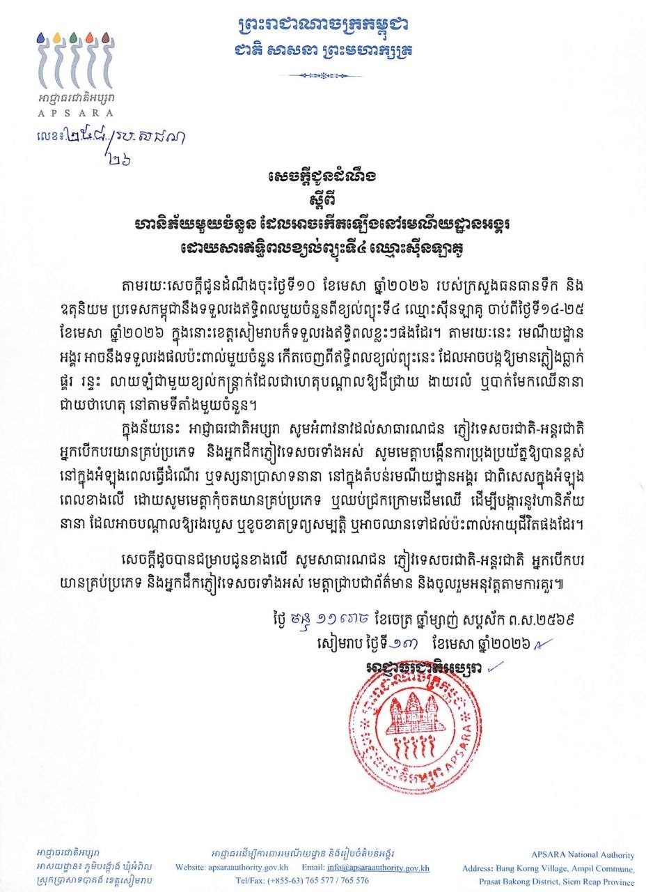 អាជ្ញាធរជាតិអប្សរា ជូនដំណឹង ស្ដីពីហានិភ័យមួយចំនួន ដែលអាចកើតឡើងនៅរមណីយដ្ឋានអង្គរ ដោយសារឥទ្ធិពលខ្យល់ព្យុះទី៤ ឈ្មោះសុីនឡាគូ