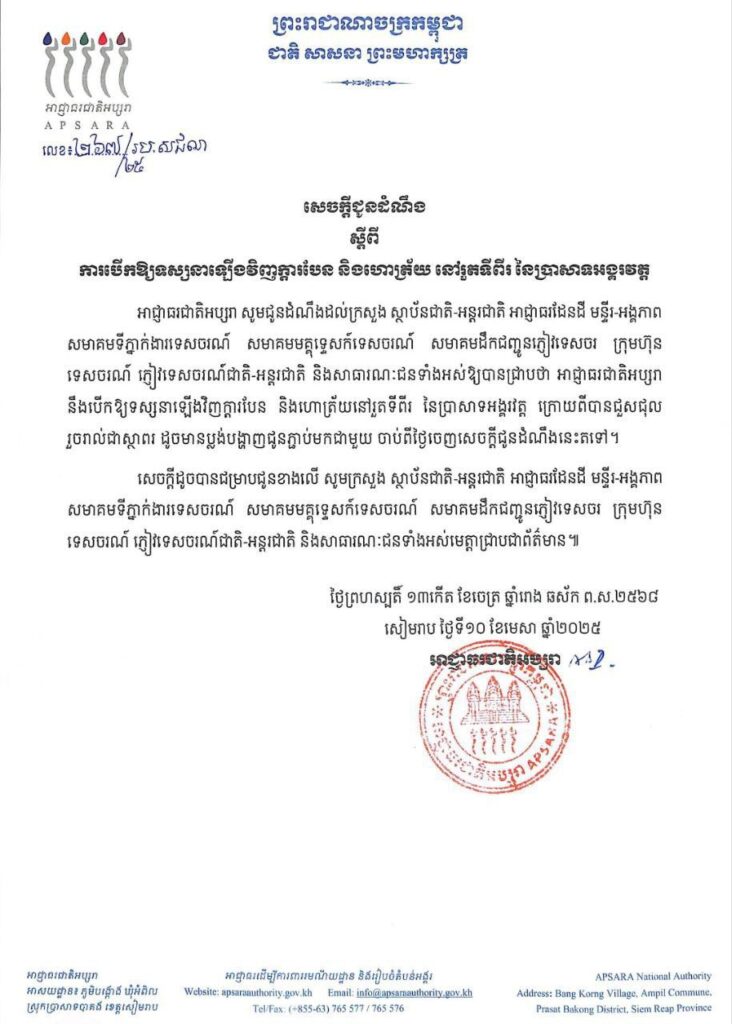 Samnang11/04/202511/04/2025 សេចក្ដីជូនដំណឹង ស្ដីពីការបើកឱ្យទស្សនាឡើងវិញក្ដារបែន និងហោត្រ័យ នៅរួតទីពីរ នៃប្រាសាទអង្គរវត្ត។