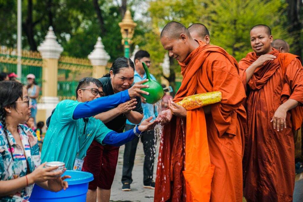 ក្នុងពិធី មានទឹកជាមួយផ្កាភ្ញី និងទឹកអប់ យកមកស្រង់ព្រះពុទ្ធបដិមា, អ្នកមានគុណ, អ្នកមានឋានៈខ្ពង់ខ្ពស់ជាង ឬចាស់ព្រឹទ្ធាចារ្យ ដើម្បីសុំខមាទោសចំពោះកំហុសឆ្គងកន្លងមក និងទទួលបានមកវិញនូវសេចក្ដីសុខចម្រើន ត្រជាក់ត្រជុំនាឱកាសឆ្នាំថ្មី។