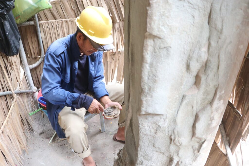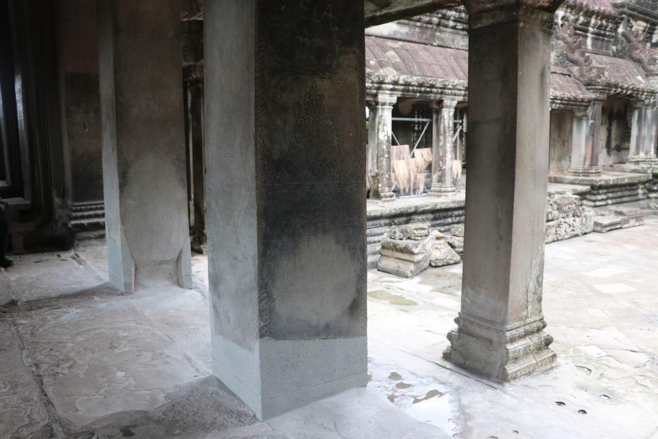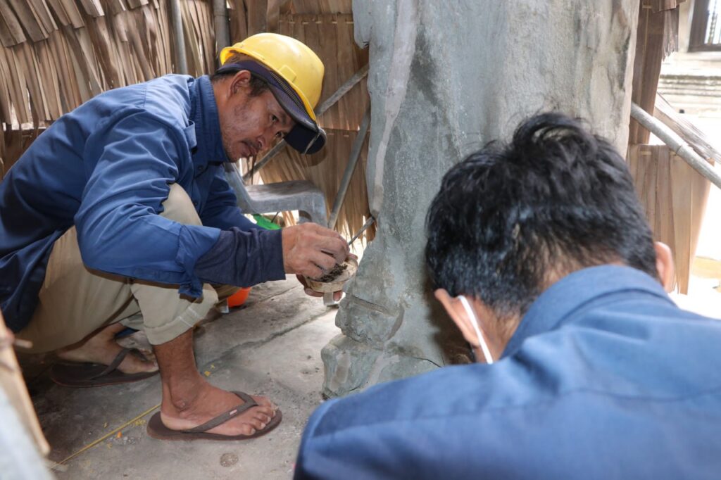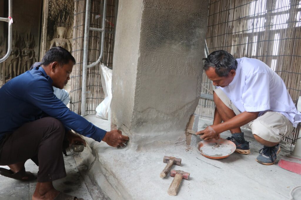 ក្រុមការងារនាយកដ្ឋានអភិរក្សប្រាសាទ និងបុរាណវិទ្យា នៃអាជ្ញាធរជាតិអប្សរា កំពុងអភិរក្ស និងជួសជុលជើងសសរនៅរួតបាកានប្រាសាទអង្គរ ដែលជើងសសរមួយចំនួនមានការពុកផុយ។