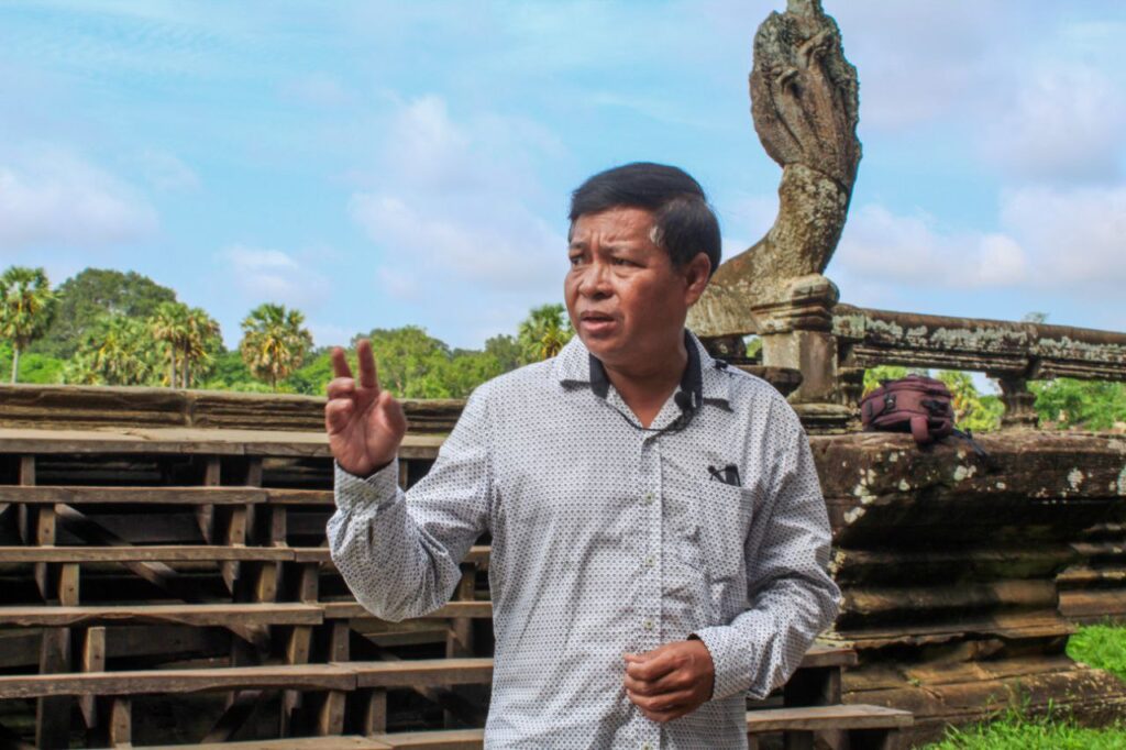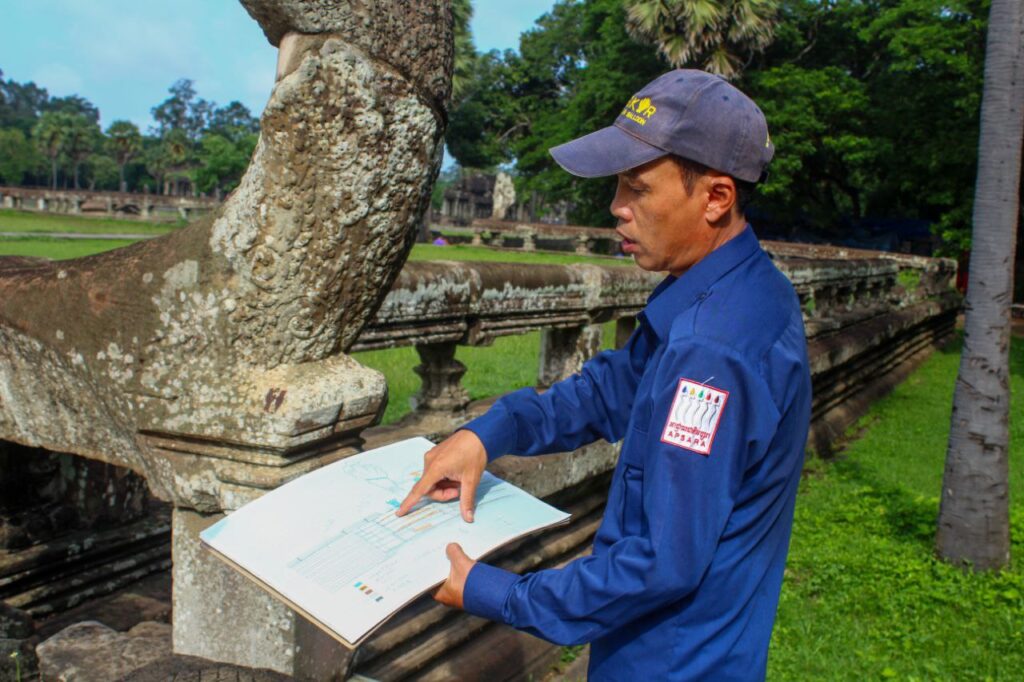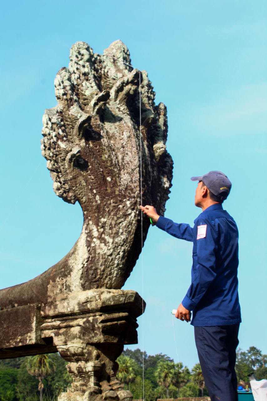 ក្រុមអ្នកបច្ចេកទេសផ្នែកអភិរក្សថ្ម នៃអាជ្ញាធរជាតិអប្សរា ធ្វើការងារសម្រង់ប្លង់បង្កាន់ដៃនាគនៅខឿនជាន់ទី១ជុំវិញប្រាសាទអង្គរវត្ត ដើម្បីសិក្សានូវចំណុចហានិភ័យនៃរចនាសម្ពន្ធបង្កាន់ដៃនាគ មុននឹងឈានទៅដល់ការជួសជុលឱ្យរឹងមាំឡើងវិញ។