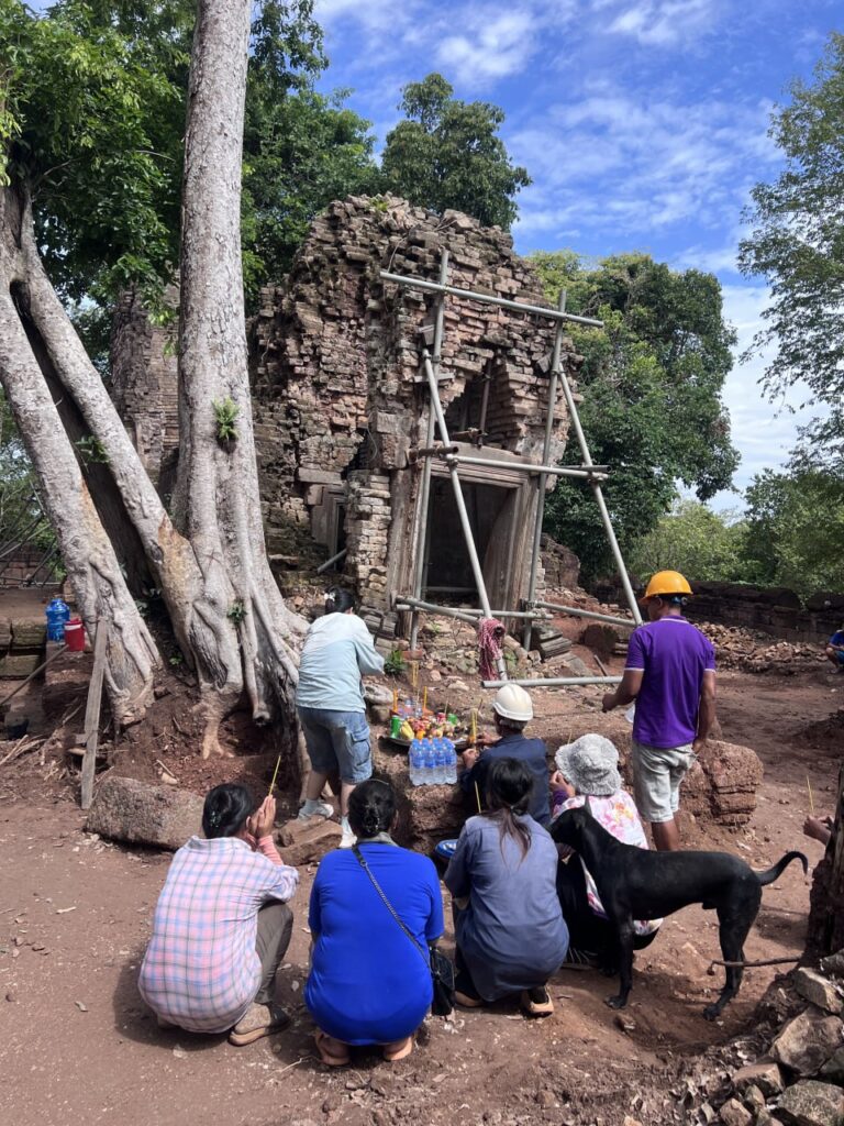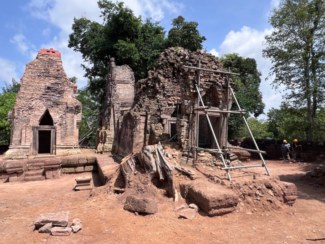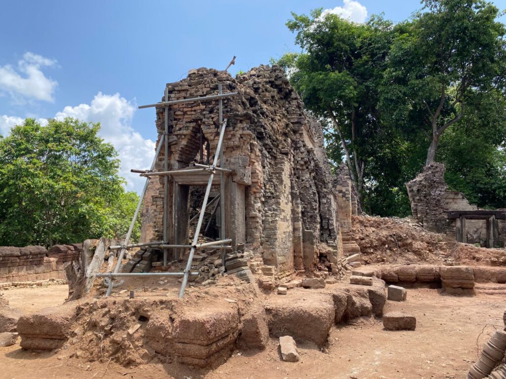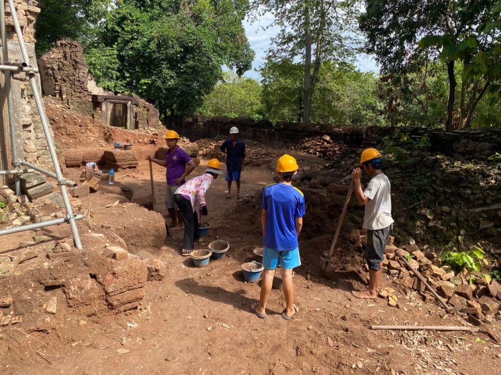 ដំណើរការជួសជុលមណ្ឌបនេះឱ្យរឹងមាំឡើងវិញ ក្រុមការងារធ្វើសម្រង់ប្លង់ និងកំណាយបកកំណកដីចាក់បង្គលើផ្ទៃខឿន និងផ្នែកខាងក្នុង កកើតពីការពុកផុយរបស់រចនាសម្ពន្ធឥដ្ឋ និងសត្វល្អិត ដោយរកឃើញបំណែកវត្ថុសិល្បៈមួយចំនួនដូចជា បំណែកផ្តែរ សសរពេជ្រ ព្រំដំបូល និងប្រមូលឥដ្ឋដែលមានគុណភាពសម្រាប់ប្រើប្រាស់ឡើងវិញ។