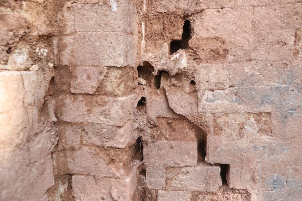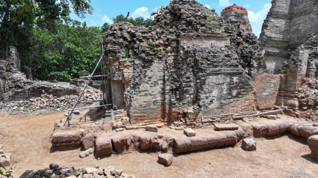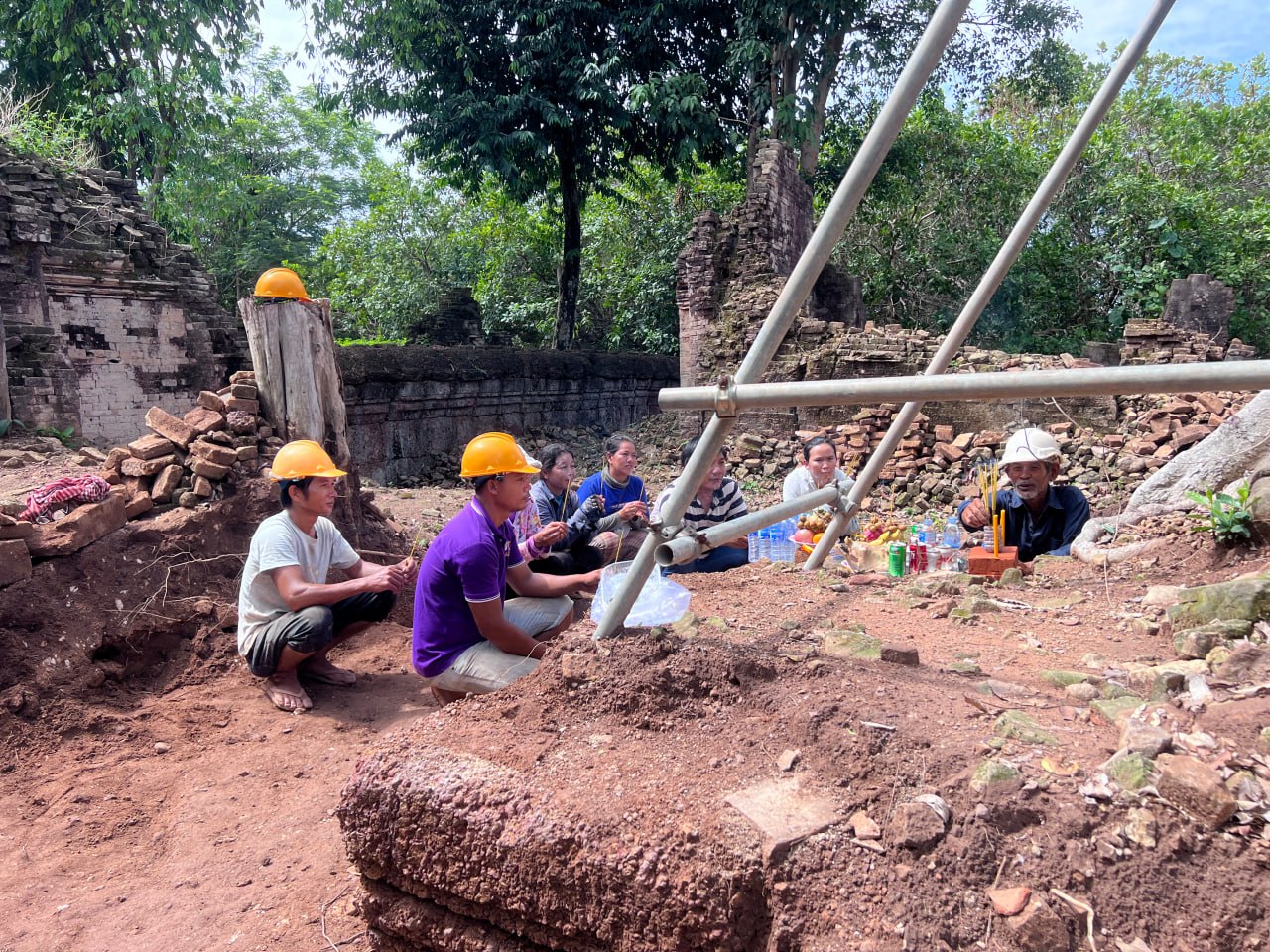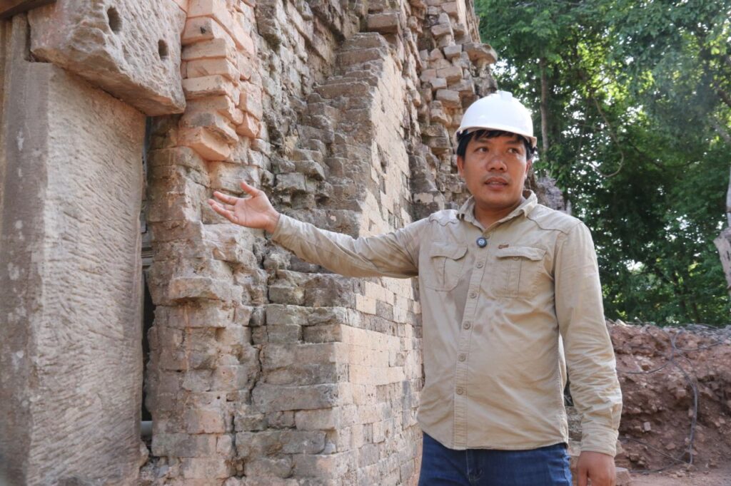 ដំណើរការជួសជុលមណ្ឌបនេះឱ្យរឹងមាំឡើងវិញ ក្រុមការងារធ្វើសម្រង់ប្លង់ និងកំណាយបកកំណកដីចាក់បង្គលើផ្ទៃខឿន និងផ្នែកខាងក្នុង កកើតពីការពុកផុយរបស់រចនាសម្ពន្ធឥដ្ឋ និងសត្វល្អិត ដោយរកឃើញបំណែកវត្ថុសិល្បៈមួយចំនួនដូចជា បំណែកផ្តែរ សសរពេជ្រ ព្រំដំបូល និងប្រមូលឥដ្ឋដែលមានគុណភាពសម្រាប់ប្រើប្រាស់ឡើងវិញ។