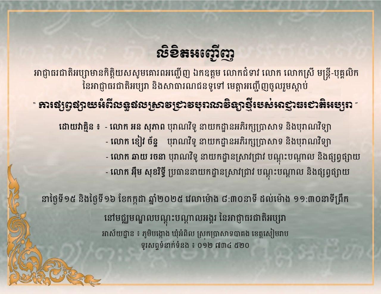 នាយកដ្ឋានស្រាវជ្រាវ បណ្ដុះបណ្ដាល និងផ្សព្វផ្សាយ នៃអាជ្ញាធរជាតិអប្សរា នឹងធ្វើបទបង្ហាញស្តីពី ការផ្សព្វផ្សាយអំពីលទ្ធផលស្រាវជ្រាវបុរាណវិទ្យាថ្មីរបស់អាជ្ញាធរជាតិអប្សរា រយៈពេល២ថ្ងៃ គឺថ្ងៃទី១៥ និងថ្ងៃទី១៦ ខែកក្កដា ឆ្នាំ២០២៥ នៅស្នាក់ការមជ្ឈមណ្ឌលបណ្ដុះបណ្ដាលអង្គរ ស្ថិតនៅភូមិបង្កោង ឃុំអំពិល ស្រុកប្រាសាទបាគង ខេត្តសៀមរាប។