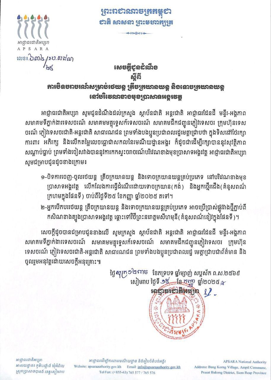 សេចក្តីជូនដំណឹង ស្ដីពីការបិទចរាចរណ៍សម្រាប់រថយន្ត ត្រីចក្រយានយន្ត និងទោចក្រយានយន្ត នៅបរិវេណខាងមុខប្រាសាទអង្គរវត្ត។ សូមអានសេចក្តីជូនដំណឹងទាំងស្រុង..