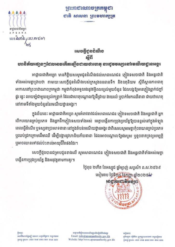 អាជ្ញាធរជាតិអប្សរា កាលពីថ្ងៃទី២៤ខែកញ្ញាឆ្នាំ២០២៥ម្សិលមិញ នេះ បានចេញសេចក្តីជូនដំណឹង ស្ដីពីហានិភ័យផ្សេងៗដែលអាចកើតឡើងជាយថាហេហេតុ នារដូវវស្សានៅរមណីយដ្ឋានអង្គរ។ សូមអានលិខិតជូនដំណឹងទាំងស្រុង..