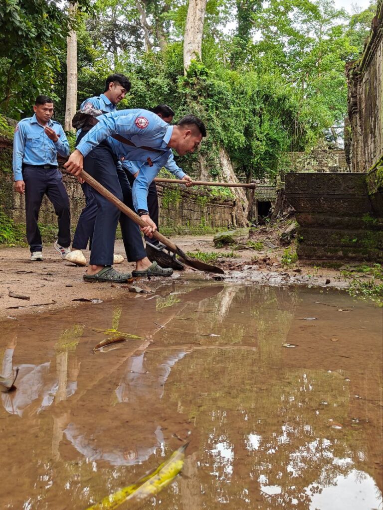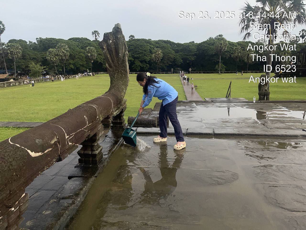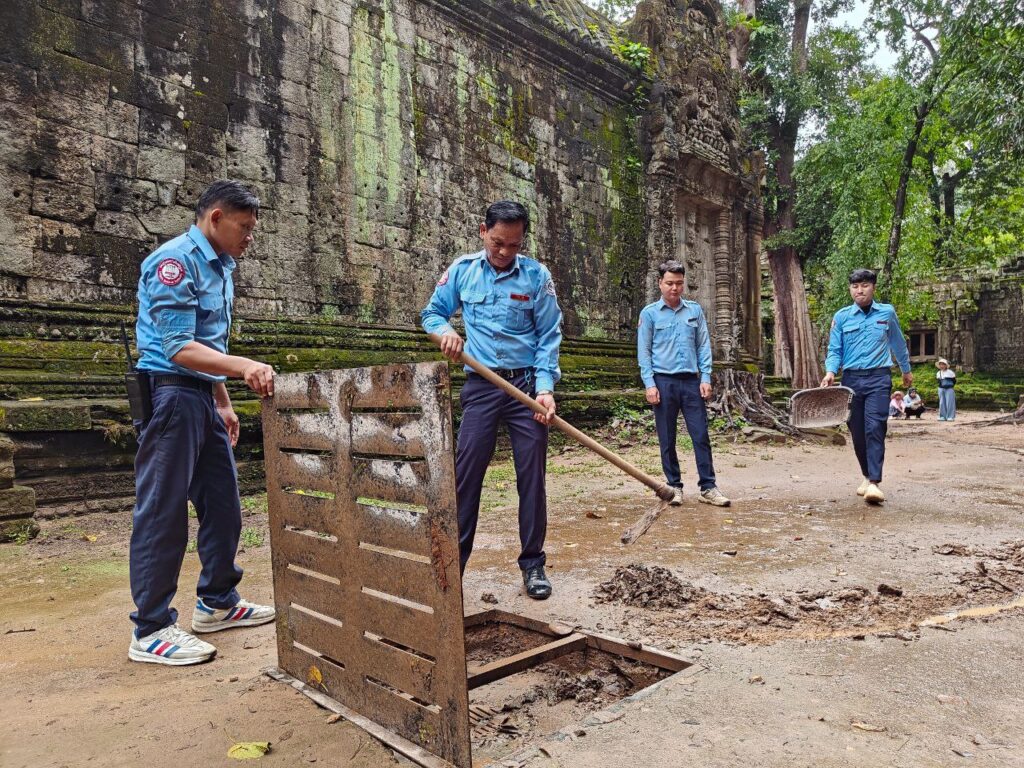 ភ្លៀងធ្លាក់ជាប់ៗគ្នា បានធ្វើឱ្យទឹកដក់រយៈពេលខ្លីនៅតាមប្រាសាទមួយចំនួនដែលពុំមានលូបង្ហូរទឹកគ្រប់គ្រាន់ ឬលូបង្ហូរទឹកមានមាត់តូចជាដើម។ ដើម្បីសម្រួលកិច្ចការងារ ឬរំដោះទឹកឱ្យបានទាន់ពេលវេលា ក្រុមភ្នាក់ងារទេសចរប្រចាំតាមគោលដៅប្រាសាទនានា បានរួមចំណែកយ៉ាងសំខាន់ ក្នុងកិច្ចការងារមួយនេះ និងយកចិត្តទុកដាក់លើសុវត្ថិភាពភ្ញៀវទេសចរ បង្ការពីគ្រោះថ្នាក់ ឬហានិភ័យនានា។