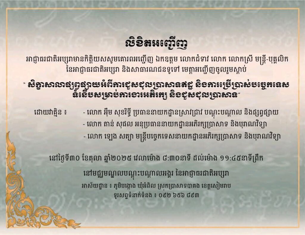អាជ្ញាធរជាតិអប្សរា អញ្ជើញសាធារណជនចូលរួមសិក្ខាសាលាក្រោមប្រធានបទ«ការជួសជុលប្រាសាទឥដ្ឋ និងការប្រើប្រាស់បច្ចេកទេសទំនើបសម្រាប់ការងារអភិរក្ស ជួសជុលប្រាសាទ» នៅថ្ងៃទី៣០ ខែតុលា ឆ្នាំ២០២៥ វេលាម៉ោង៨កន្លះព្រឹក នៅមជ្ឈមណ្ឌលបណ្តុះបណ្តាលអង្គរ នៃទីស្នាក់ការអាជ្ញាធរជាតិអប្សរា ស្ថិតនៅភូមិបង្កោង ឃុំអំពិល ស្រុកប្រាសាទបាគង ខេត្តសៀមរាប។