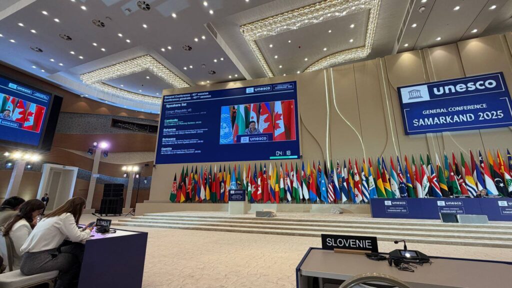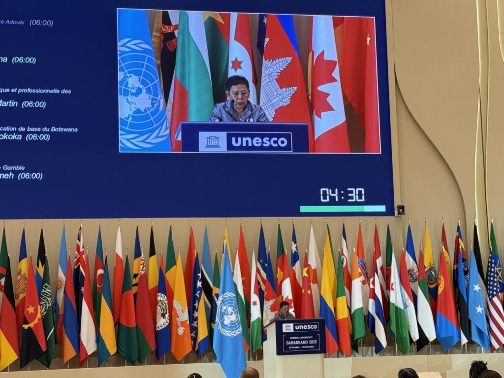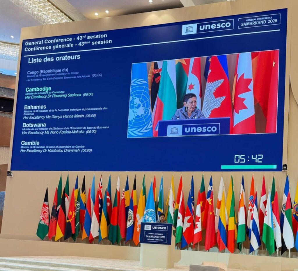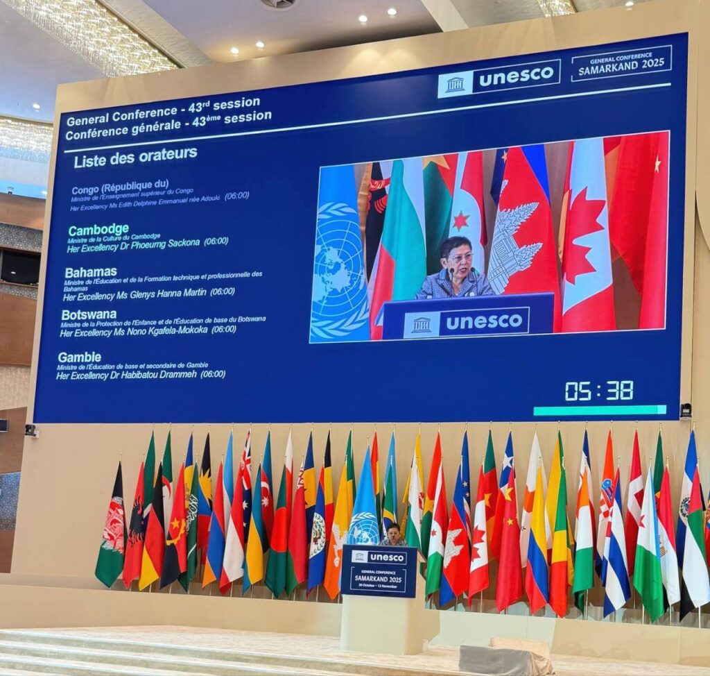នៅទីក្រុងសាម៉ាកាន់ ប្រទេសអ៊ូសបេគីស្តង់ នារសៀលថ្ងៃទី០៣ ខែវិច្ឆិកា ឆ្នាំ២០២៥ លោកជំទាវបណ្ឌិតសភាចារ្យ ភឿង សកុណា រដ្ឋមន្រ្តីក្រសួងវប្បធម៌ និងវិចិត្រសិល្បៈ អញ្ជើញថ្លែង សន្ទរកថាអំពីគោលនយោបាយរបស់រាជរដ្ឋាភិបាលកម្ពុជាក្នុងអង្គមហាសន្និបាតលើកទី៤៣នៃអង្គការយូណេស្កូ ដោយបានបញ្ជាក់ជាថ្មីនូវការប្តេជ្ញាចិត្តរបស់រាជរដ្ឋាភិបាលកម្ពុជាក្នុងការគាំទ្របេសកកម្មរបស់អង្គការយូណេស្កូក្នុងការស្ថាបនាសន្តិភាពតាមរយៈការអប់រំ វប្បធម៌ វិទ្យាសាស្ត្រ និងទំនាក់ទំនង ស្របតាមយុទ្ធសាស្ត្របញ្ចកោណ ដំណាក់កាលទី១។