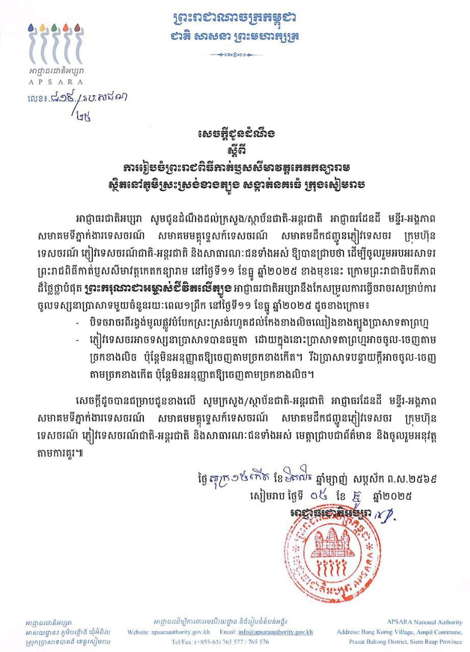 អាជ្ញាធរជាតិអប្សរា ចេញសេចក្តីជូនដំណឹង ស្ដីពីការរៀបចំព្រះរាជពិធីកាត់ឫសសីមាវត្តកេតកន្យារាម ស្ថិតនៅភូមិស្រះស្រង់ខាងត្បូង សង្កាត់នគរធំ ក្រុងសៀមរាប។ សូមអានលិខិតជូនដំណឹងទាំងស្រុង