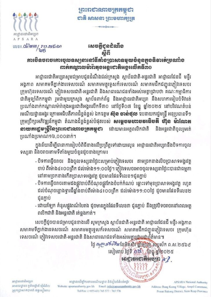 អាជ្ញាធរជាតិអប្សរា បានចេញសេចក្តីជូនដំណឹង ស្ដីពីការបិទចរាចរការចូលទស្សនានៅទីតាំងប្រាសាទមួយចំនួនក្នុងទិវារត់ប្រណាំងពាក់កណ្តាលម៉ារ៉ាតុងអន្តរជាតិអង្គរលើកទី៣០.។សូមអានលិខិតជូនដំណឹងទាំងស្រុង..