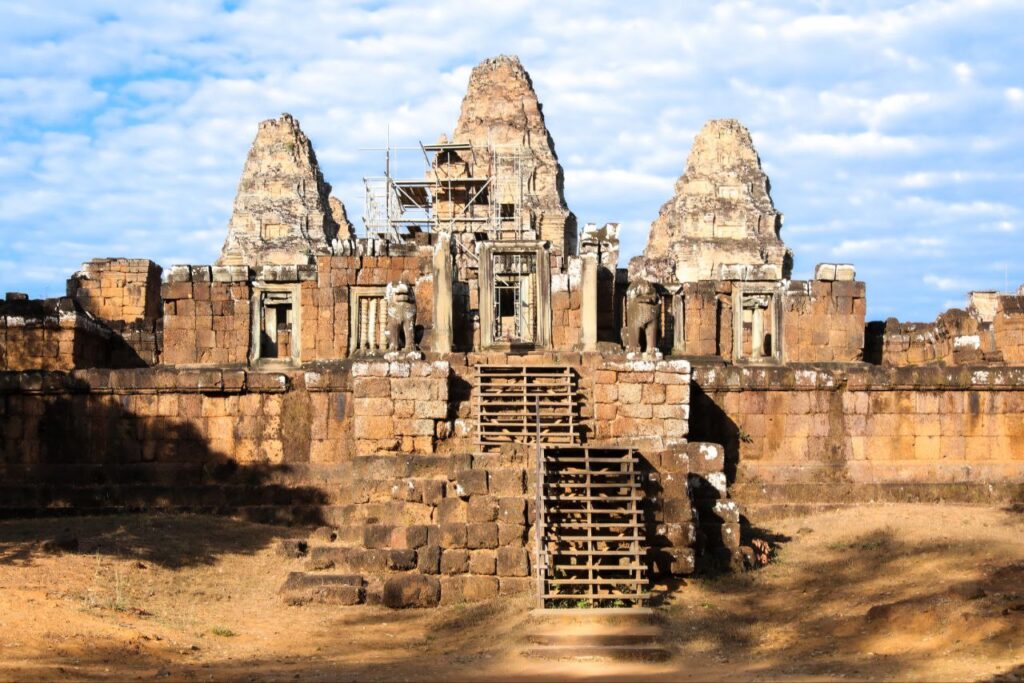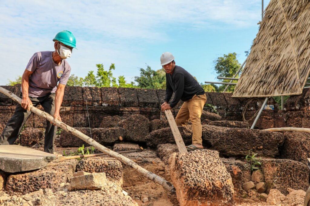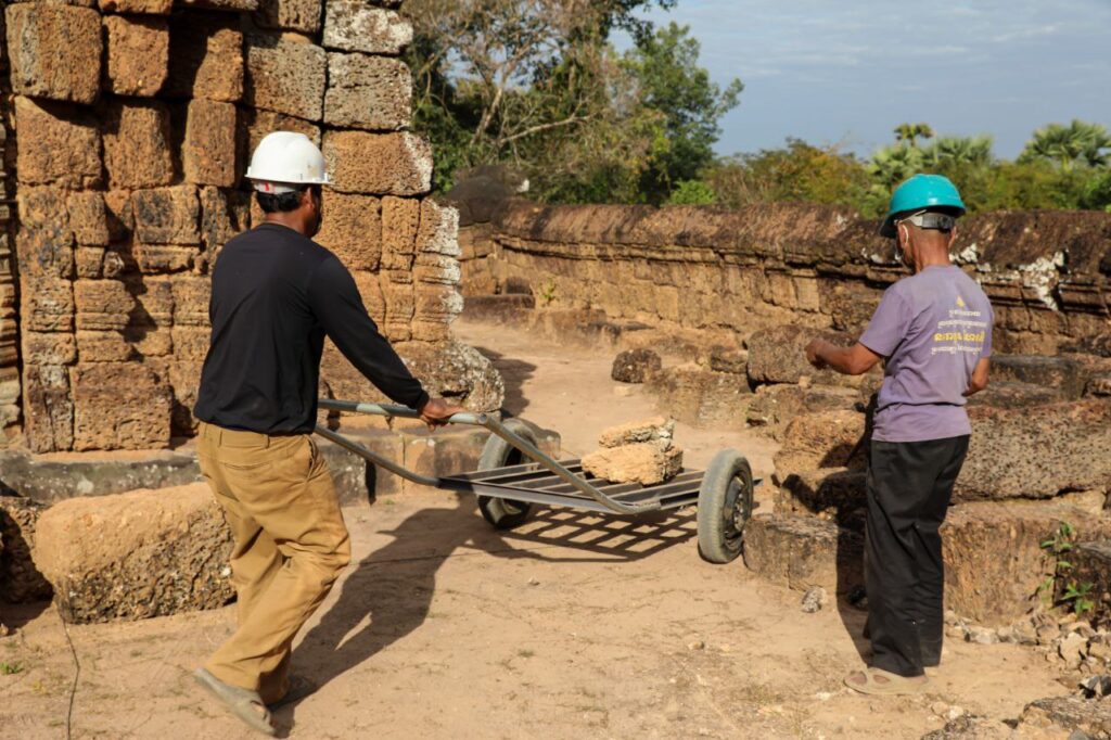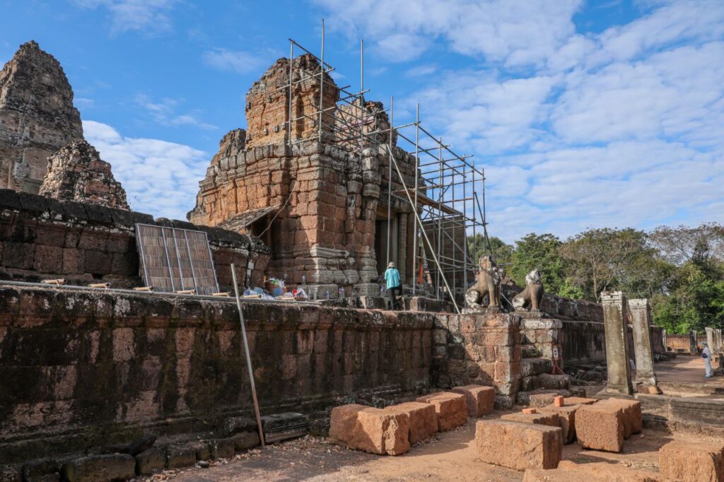ក្រុមការងារនៃនាយកដ្ឋានអភិរក្សប្រាសាទ និងបុរាណវិទ្យា នៃអាជ្ញាធរជាតិអប្សរា កំពុងជួសជុលខ្លោងទ្វារខាងជើងនៅប្រាសាទមេបុណ្យខាងកើត ដែលបានរងការខូចខាតទ្រុឌទ្រោមដោយកត្តាជាច្រើន។