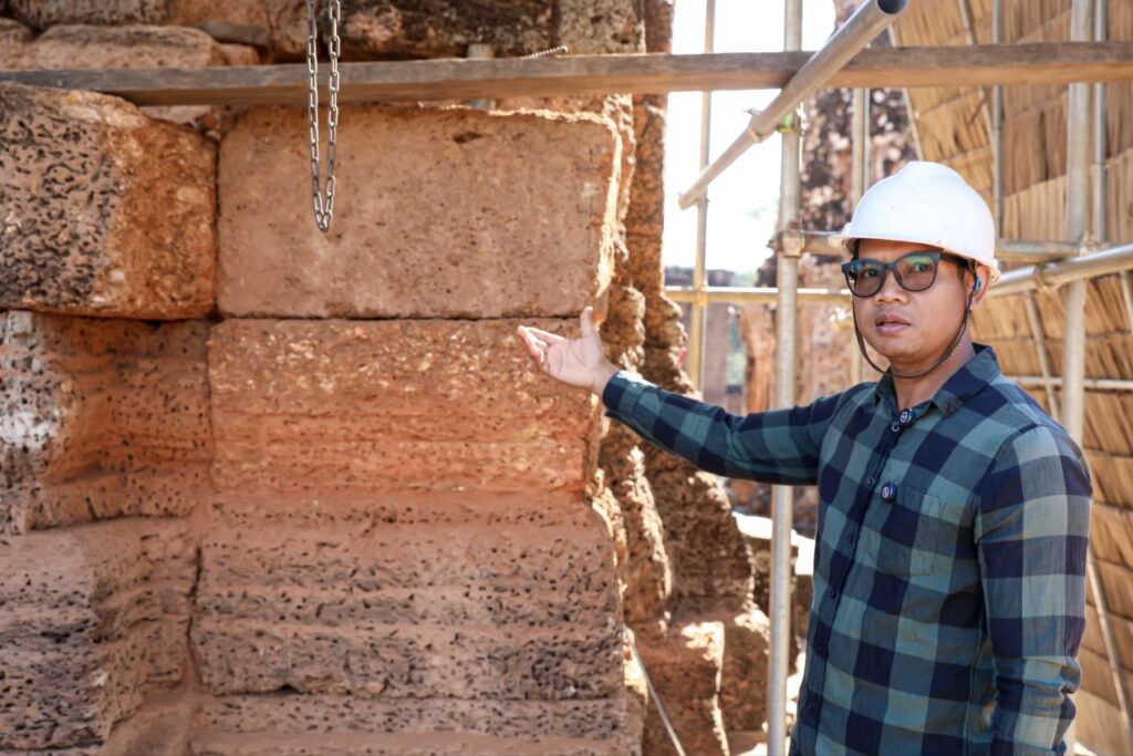 ក្នុងនោះ ក្រុមការងារផ្តោតសំខាន់ទៅលើការជួសជុលគ្រឹះ និងជញ្ជាំងថ្មបាយក្រៀម ដែលព័ទ្ធជុំវិញជារចនាសម្ពន្ធសម្រាប់ទ្រទ្រង់ដល់តួប៉មឥដ្ឋផ្នែកខាងលើ ដោយធ្វើការសម្អាតយកកំណកដីចេញពីតាមចន្លោះថ្នេរថ្ម និងកន្លែងប្រេះ រួចបិតបាយអឡើងវិញ ដើម្បីធានាមិនឱ្យទឹកជ្រាបចូល។