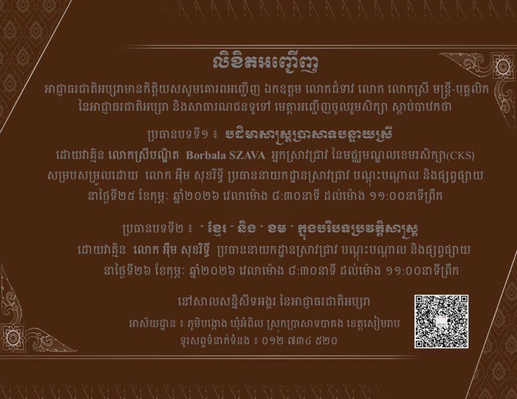អាជ្ញាធរជាតិអប្សរានឹងរៀបចំធ្វើបាឋកថារយៈពេល២ថ្ងៃ ដែលមានប្រធានបទចំនួនពីរ ដោយនៅថ្ងៃទី២៥ ខែកុម្ភៈ ឆ្នាំ២០២៦ វេលាម៉ោង៨:៣០នាទីដល់ម៉ោង១១:០០នាទីព្រឹក នឹងនិយាយពី«បដិមាសាស្រ្តប្រាសាទបន្ទាយស្រី» បទបង្ហាញដោយលោកស្រីបណ្ឌិត Borbala SZAVA អ្នកស្រាវជ្រាវមកពីមជ្ឈមណ្ឌលខេមរសិក្សា(CKS) ដែលសម្របសម្រួលដោយលោក អ៊ឹម សុខរិទ្ធី ប្រធាននាយកដ្ឋានស្រាវជ្រាវ បណ្ដុះបណ្ដាល និងផ្សព្វផ្សាយ។