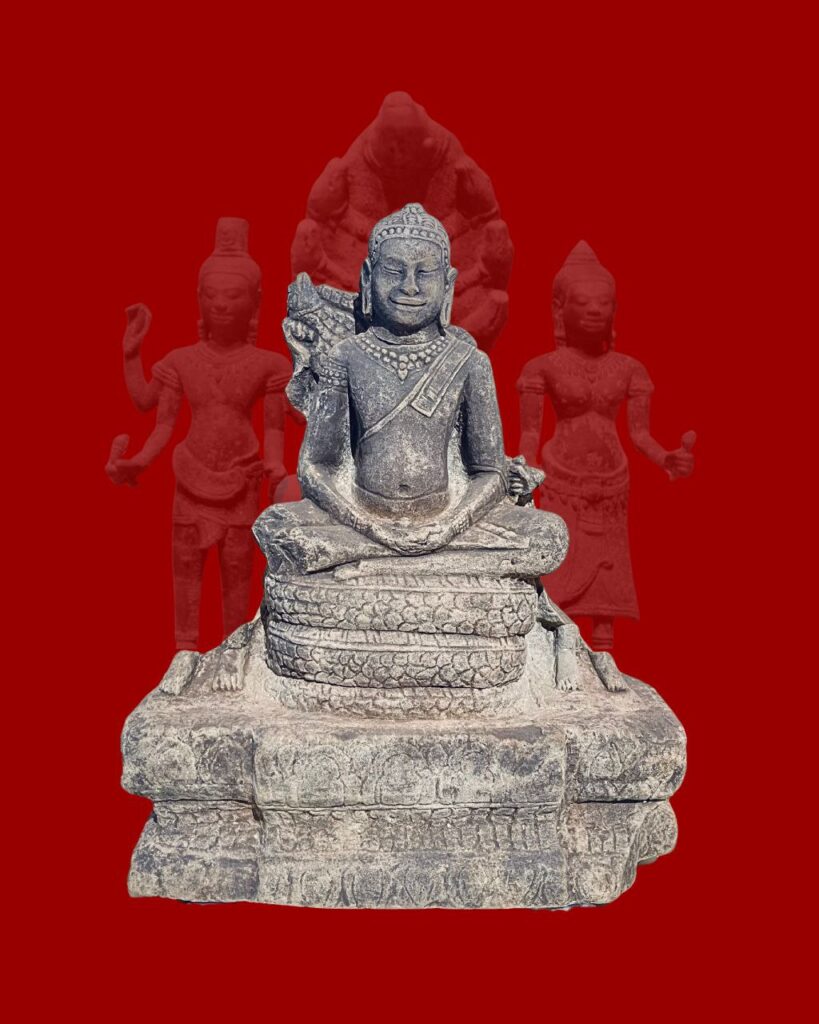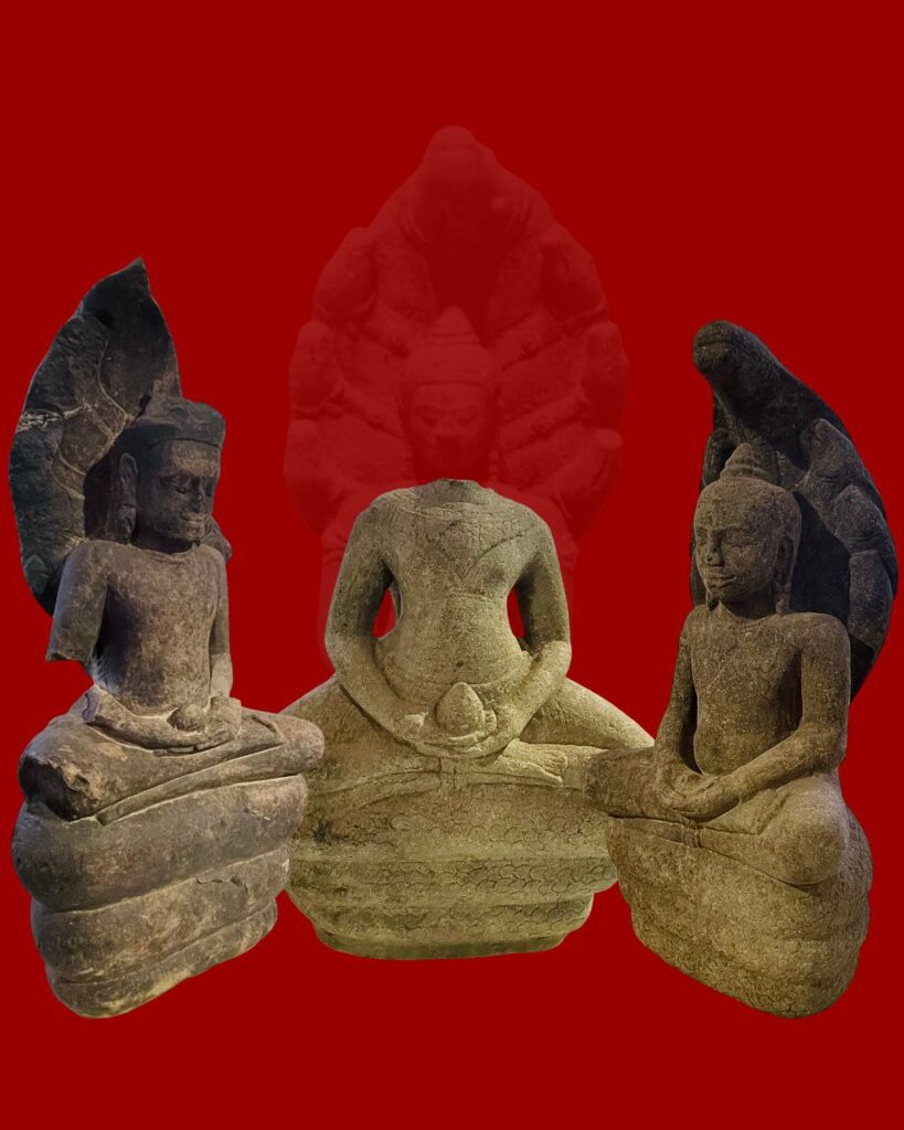 -ទម្រង់ទី៣៖ ចម្លាក់ក្រឡោតខ្ពស់លើផ្ទាំងថ្ម បង្ហាញពីព្រះពុទ្ធគង់ភ្នែនលើបល្ល័ង្កនាគ ដោយមានព្រះលោកេសូរខាងស្តាំ និងព្រះនាងប្រាជ្ញាបារមីនៅខាងឆ្វេង។