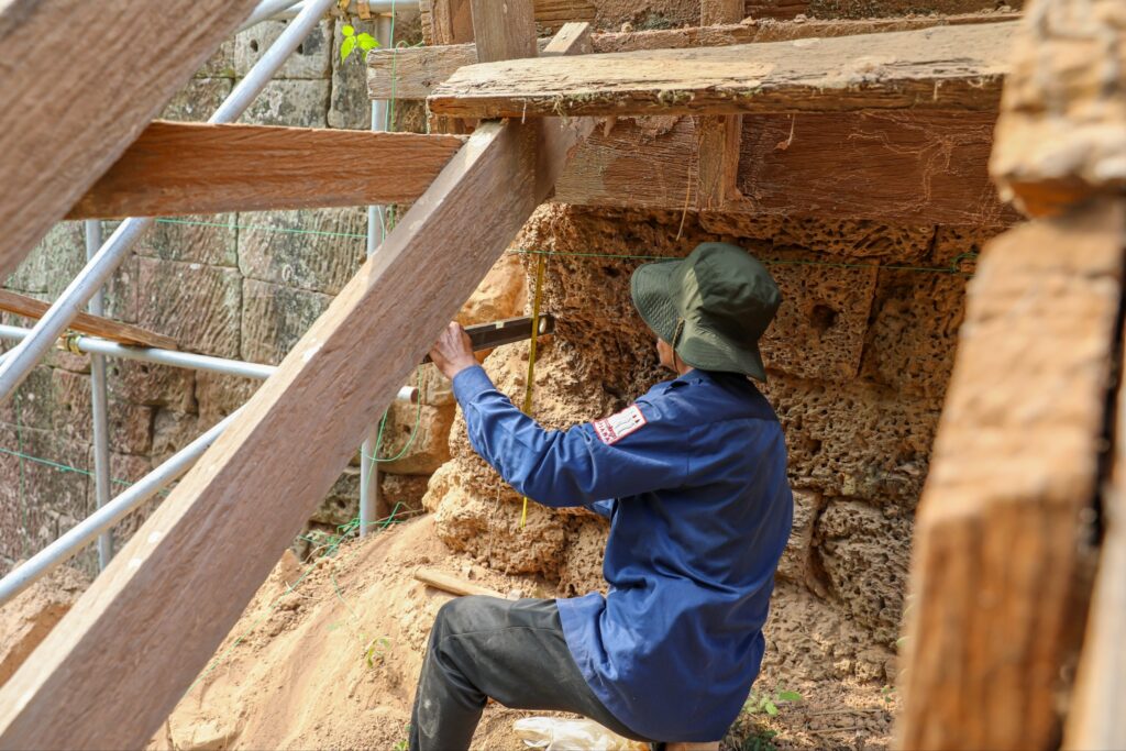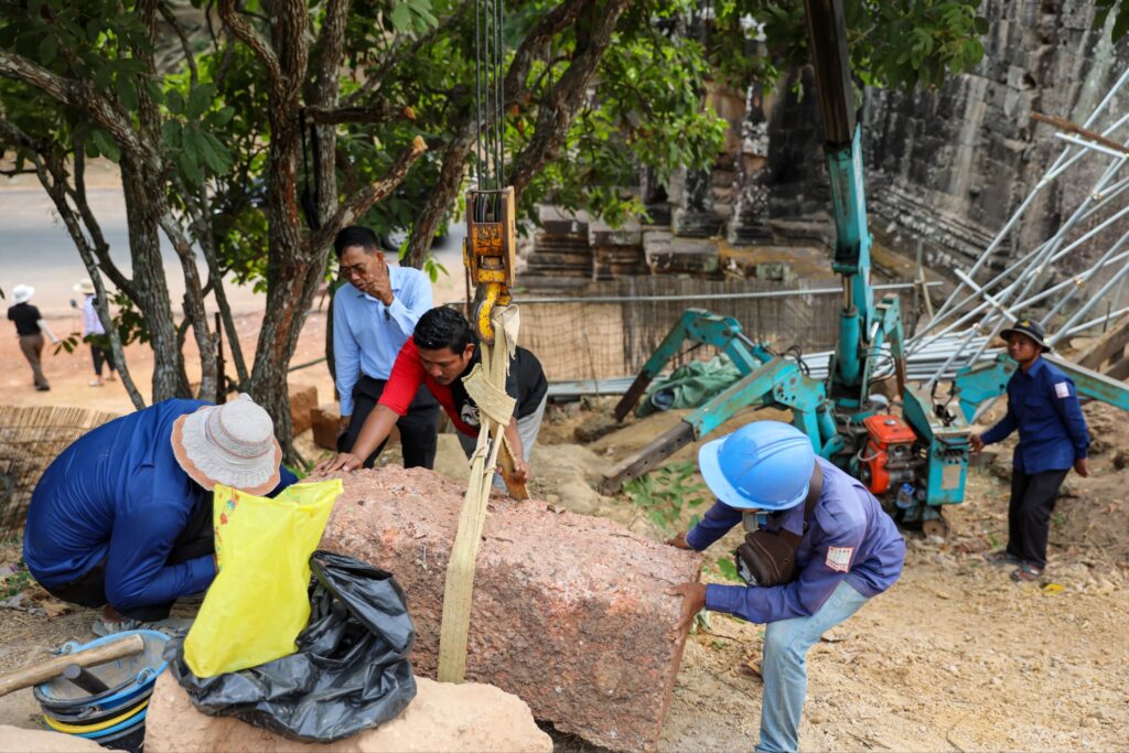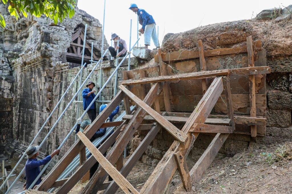ក្រុមអ្នកបច្ចេកទេសនៃអាជ្ញាធរជាតិអប្សរា កំពុងដំណើរការជួសជុលជញ្ជាំងកំពែងធ្វើពីថ្មបាយក្រៀមរបស់ក្រុងអង្គរធំប្រវែង១៥ម៉ែត្រ នៅផ្នែកខាងត្បូង ឆៀងខាងលិចនៃខ្លោងទ្វារទន្លេអុំ ដែលកំពុងរងការខូចខាត ឱ្យប្រសើរឡើងវិញ។