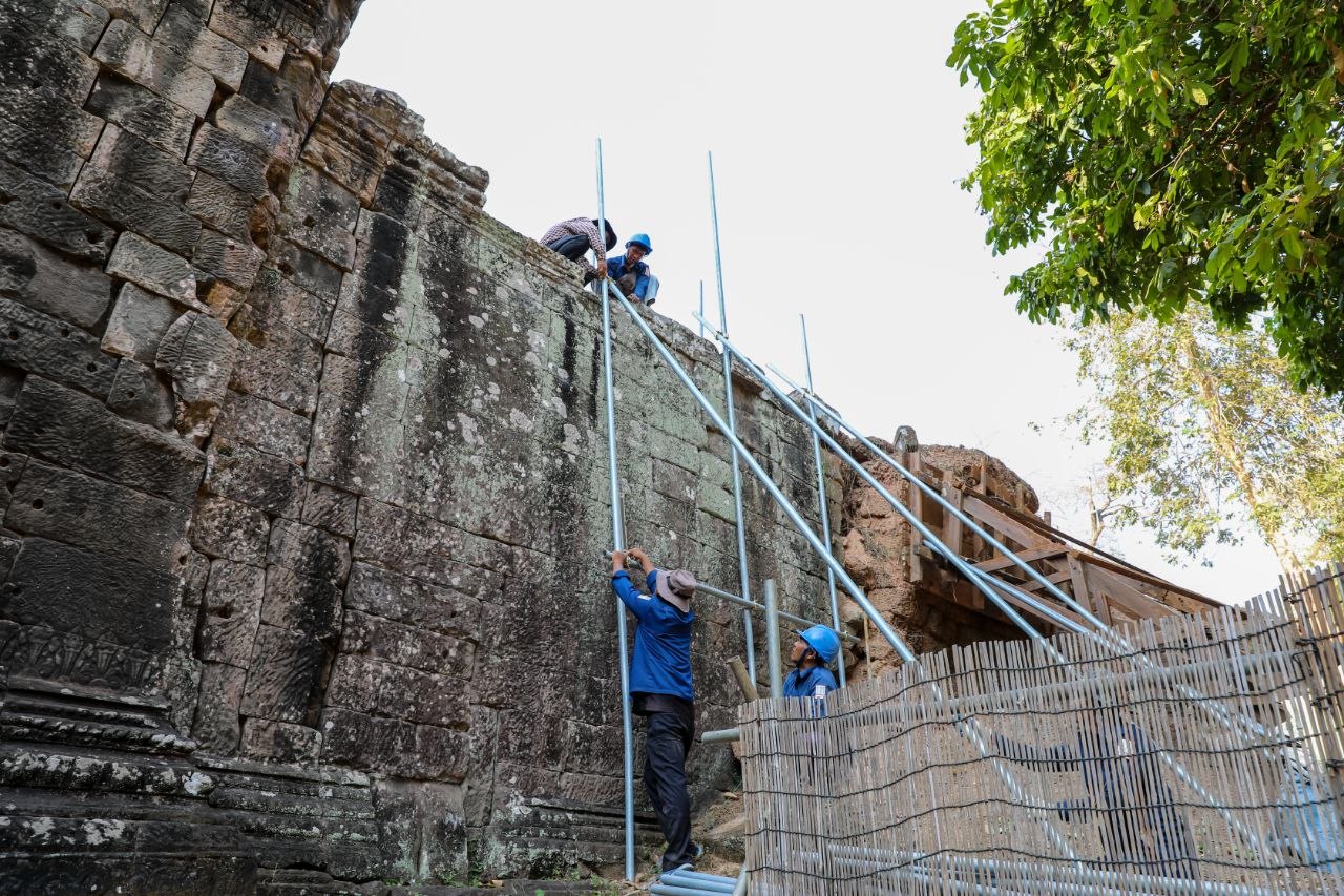 ការងារជួសជុលនេះ គឺក្រុមការងារបានអនុវត្តទៅតាមបច្ចេកទេស ដោយមានការទល់ទ្រពេលរើជញ្ជាំង ហើយនៅតាមកន្លែងណាដែលមានបញ្ហាហែក គឺត្រូវរឹតកុំឱ្យទឹកហូរច្រោះជាដើម។ រើស្រទាប់ថ្មជញ្ជាំងបាយក្រៀមណាដែលហែកក្រៀកម្តងមួយស្រទាប់ៗ ហើយត្រូវរៀបឡើងវិញ។ ប្រសិនបើគ្រឹះមានបញ្ហា គឺត្រូវជួសជុលទាំងគ្រឹះ រួចហើយបន្តជួសជុលជញ្ជាំង ឱ្យរត់ត្រង់ជាមួយខ្លោងទ្វារ។ ចំណែកកាំជណ្តើរថ្មបាយក្រៀមនឹងរៀបចំឡើងវិញ ដើម្បីជួយទប់ដីកុំឱ្យទឹកភ្លៀងហូរច្រោះ។